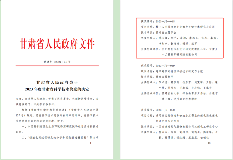 近日,2023年度甘肅省科學(xué)技術(shù)獎結(jié)果揭曉,公司和蘭州有色冶金設(shè)計研究院有限公司聯(lián)合申報的科技成果項目《稀土工業(yè)固液廢安全貯存關(guān)鍵技術(shù)研究與應(yīng)用》榮獲2023年度甘肅省科技進步獎二等獎。