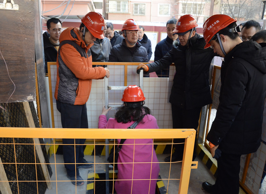 參會領導、專家和專業(yè)技術人員首先到蘭州市大砂坪甘南花園老舊小區(qū)改造項目現場觀摩了由公司實施的該小區(qū)1-3號樓頂升糾偏加固施工,排隊依次深入樓基礎導坑靜壓樁頂升托換作業(yè)面,實地考察了解了公司面對施工作業(yè)樓宇2樓及以上居民未搬離、現場場地狹小局促、施工條件較差、作業(yè)環(huán)境復雜、管理難度大等困難,在保證居民正常生活和居住安全、施工進度和質量前提下,精心策劃和采取的設計、加固方案以及施工工藝、安全和管理措施。
